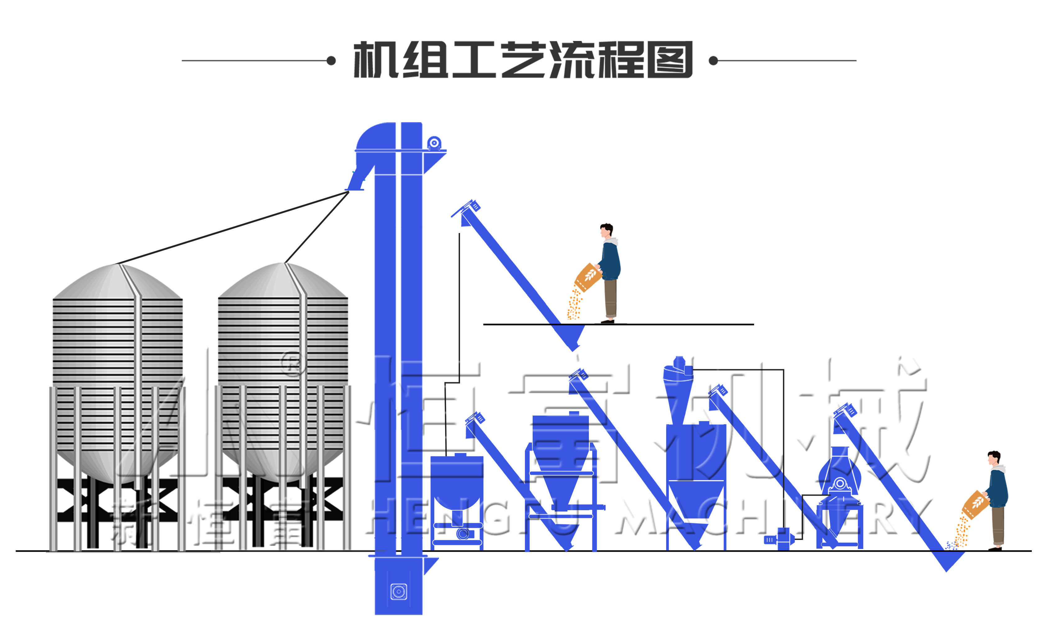 搭配的設(shè)備有水滴型粉碎機(jī)、配料秤、單軸雙螺旋混合機(jī)、提升輸送設(shè)備、除塵除鐵設(shè)備、緩沖倉(cāng)、兩個(gè)20噸成品料塔、電控柜、配件等。