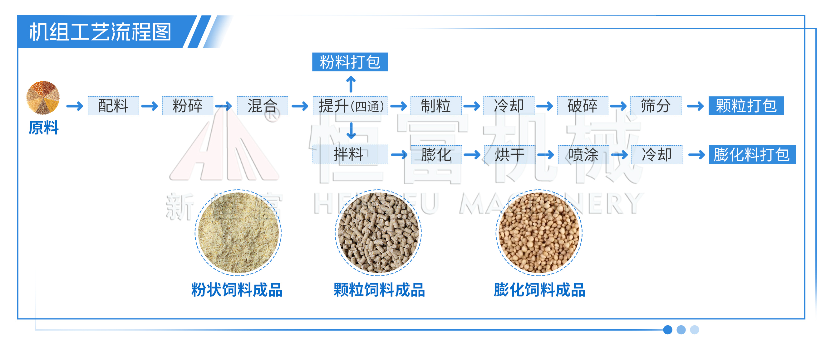 顆粒生產(chǎn)線:水滴式粉碎機(jī)、單軸雙螺旋混合機(jī)、環(huán)模顆粒機(jī)、冷卻器、破碎機(jī)、掛篩、包裝秤、脈沖除塵器、空氣壓縮系統(tǒng)、蒸汽系統(tǒng)、油液添加系統(tǒng)、電控系統(tǒng)、以及提升輸送設(shè)備。