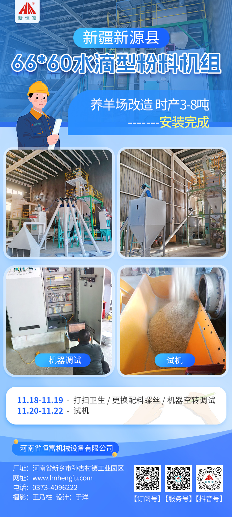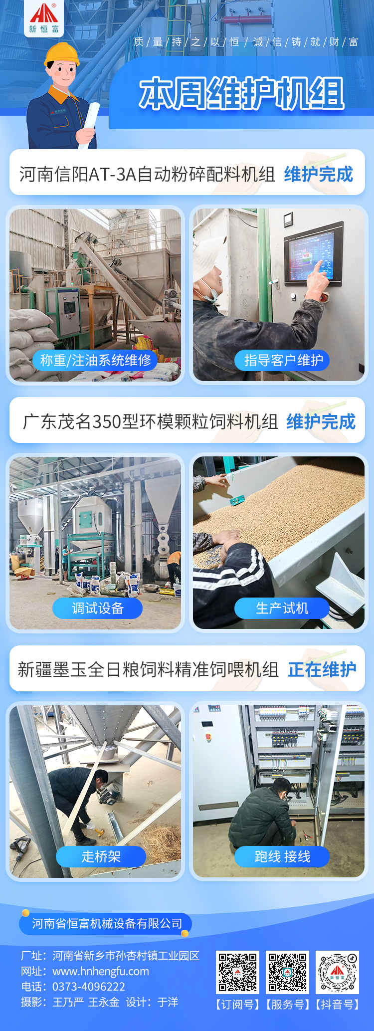 在上周,恒富機(jī)械有2套成套設(shè)備安裝完成,2套成套設(shè)備正在安裝,2套成套設(shè)備維護(hù)完成,1套成套設(shè)備正在維護(hù)。