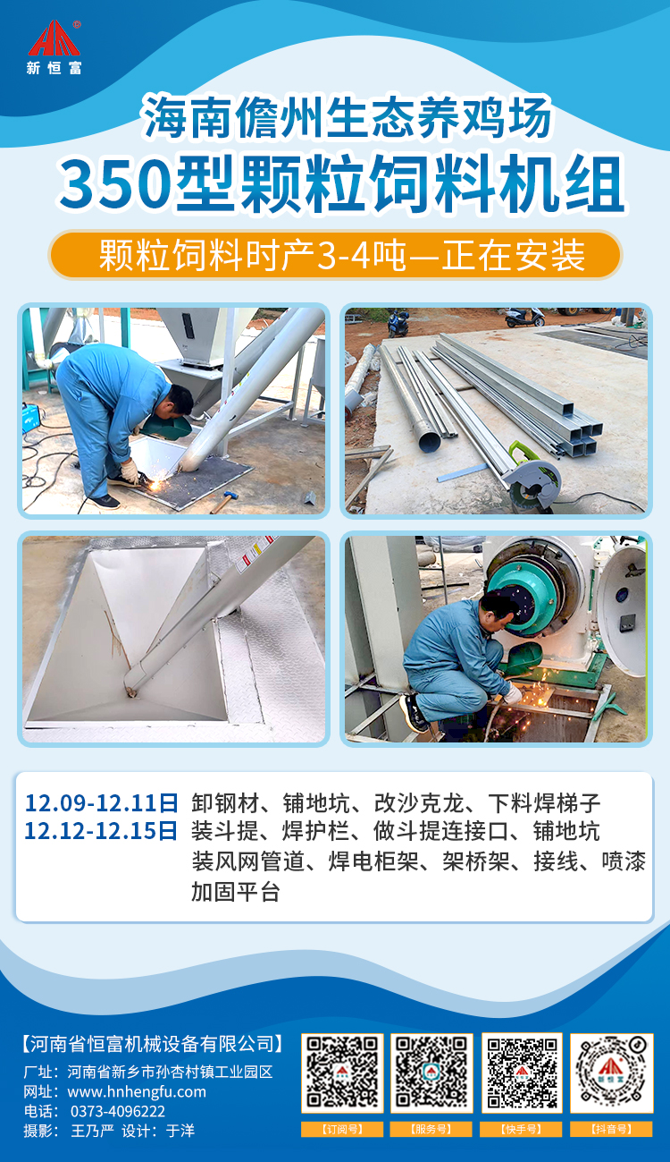 海南儋州生態(tài)養(yǎng)雞場,時產(chǎn)4噸顆粒飼料加工機組正在安裝。