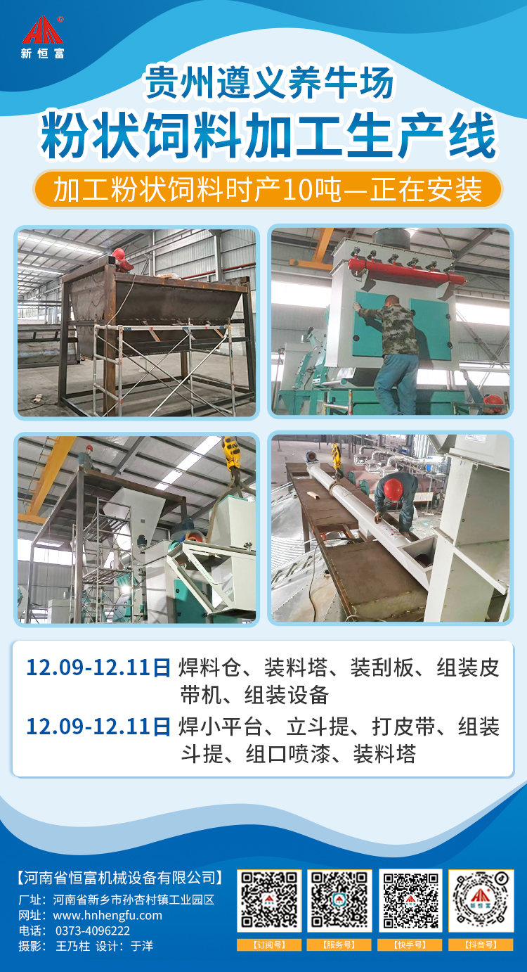 貴州遵義養(yǎng)牛場,時產(chǎn)10噸粉狀飼料加工生產(chǎn)線正在安裝。