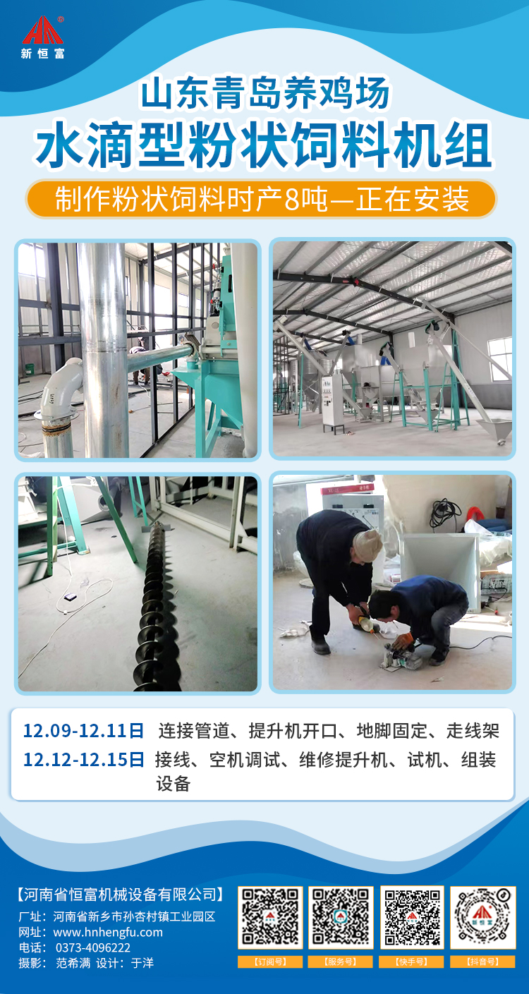 山東青島蛋雞養(yǎng)殖場,時產(chǎn)8噸粉狀飼料加工機組正在安裝。