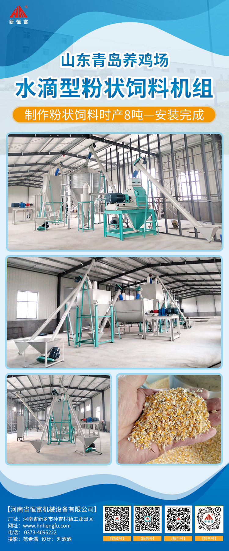 山東青島蛋雞養(yǎng)殖場(chǎng),時(shí)產(chǎn)8噸粉狀飼料加工機(jī)組安裝完成。