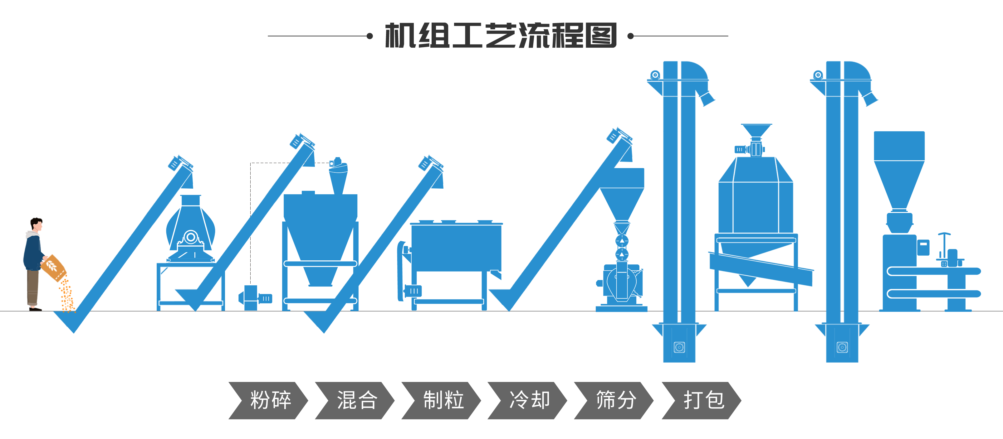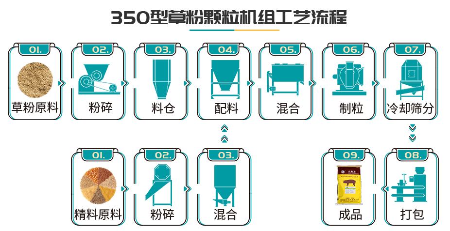 本套生產(chǎn)線主要以80%干草和20%精糧為原料制作草粉顆粒飼料。搭配主要設(shè)備有:多功能飼料粉碎機(jī)、自吸式粉碎混合一體機(jī)、飼料配料秤、臥式單軸雙螺帶飼料混合機(jī)、環(huán)模飼料顆粒機(jī)、逆流式飼料冷卻器、飼料振動(dòng)篩以及飼料定量包裝機(jī)等,該機(jī)組即可制作精料顆粒飼料也可制作草粉顆粒飼料,且自動(dòng)化程度高,可大大降低人工成本。